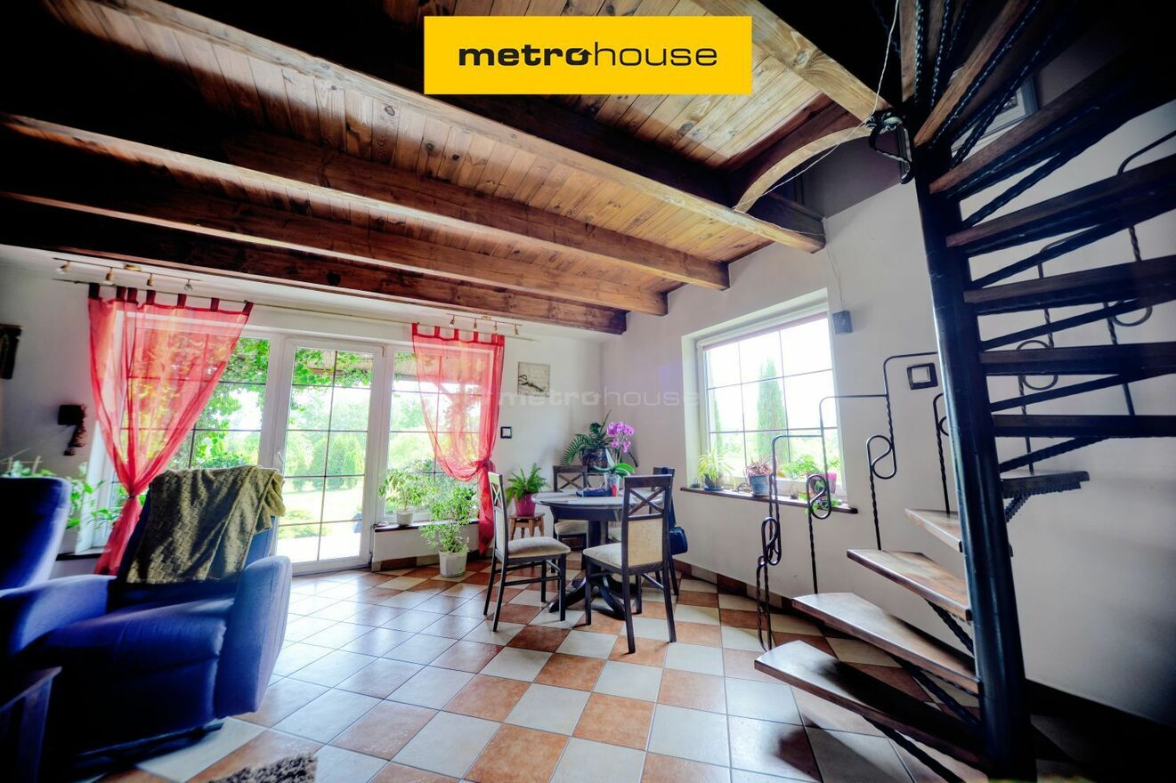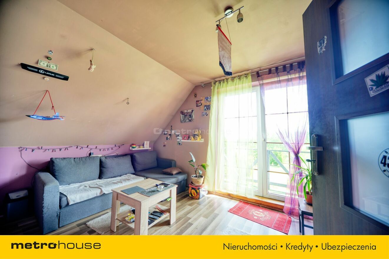 Na parterze budynku o całkowitej powierzchni 97,17m2, znajduje się kuchnia, łazienka, spiżarnia oraz salon z pięknym widokiem na zielony ogród. W salonie kominek, który stanowi centralne źródło ogrzewania. Z salonu biegną otwarte schody wykonane w technologii konstrukcji stalowej prowadzące do pomieszczeń znajdujących się na poddaszu. Tam znajdują się 3 pokoje oraz pomieszczenie gotowe do zaadaptowania jako łazienka (możliwość usunięcia ścianek działowych i stworzenie przejrzystego poddasza). Wszystkie podłogi na poddaszu zostały wykonane z drewna, co dodaje uroku pomieszczeniom. Budynek gotowy do zamieszkania po niewielkim odświeżeniu ścian.
